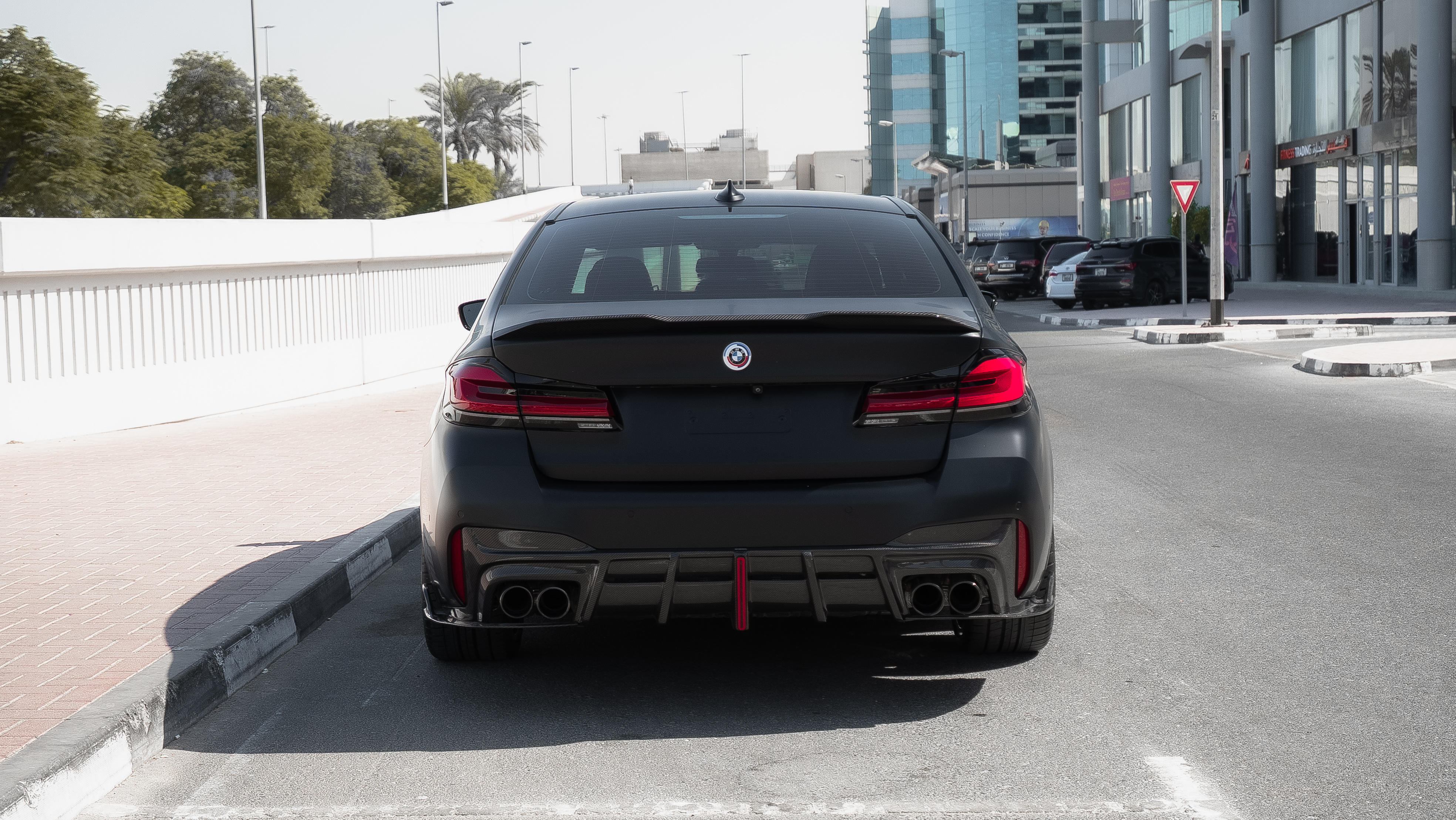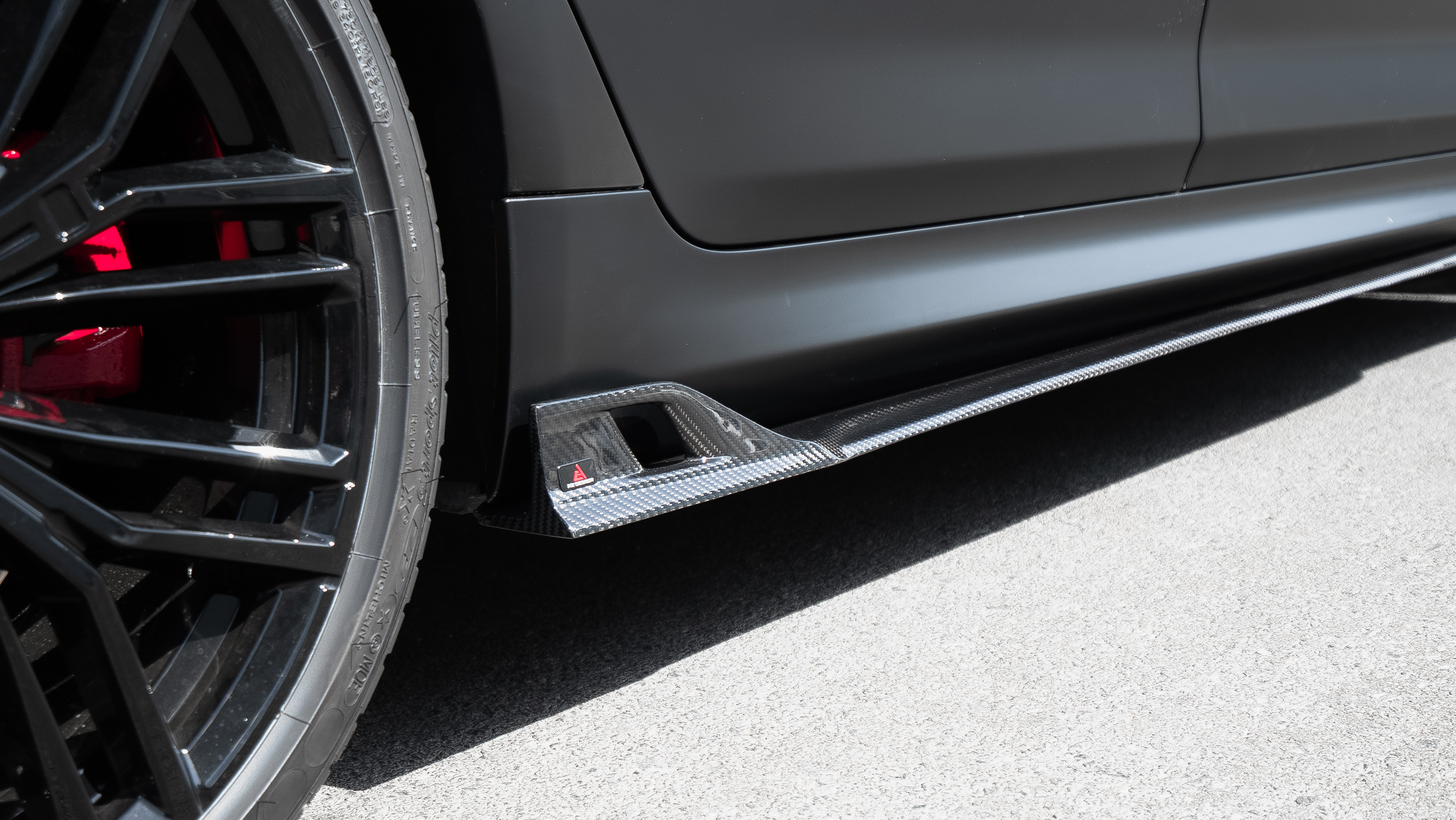 The exterior upgrade included the installation of a complete dry carbon body kit. Carbon components were installed across multiple areas of the vehicle, including the hood, front splitters, kidney grilles, mirror covers, front fenders, side skirts, rear diffuser, and rear spoiler. Using dry carbon fiber elements helps reduce overall vehicle weight while giving the BMW M550i a cleaner and more dynamic appearance on the road. The carbon parts emphasize the proportions of the car and reinforce its performance-oriented design.