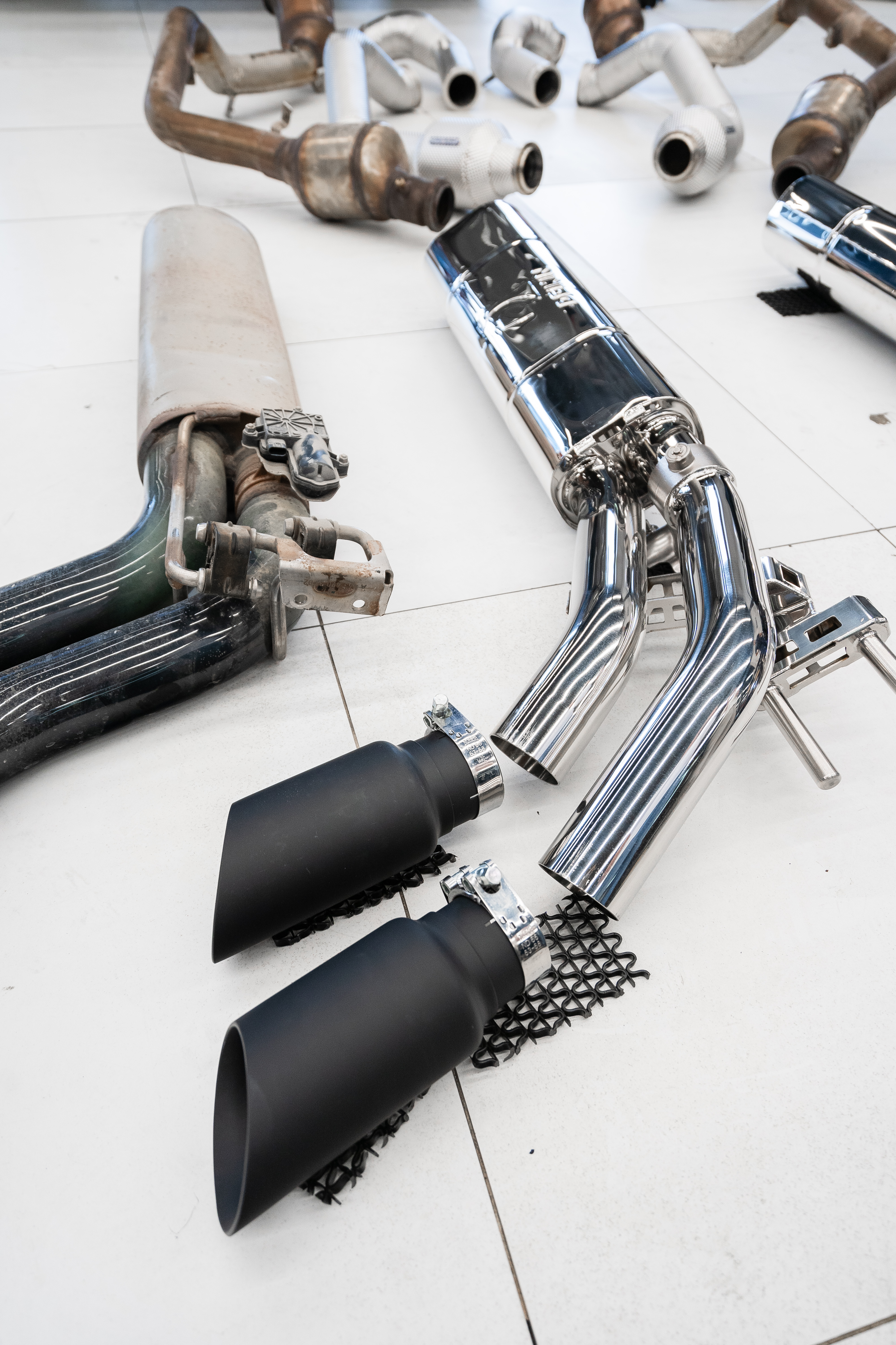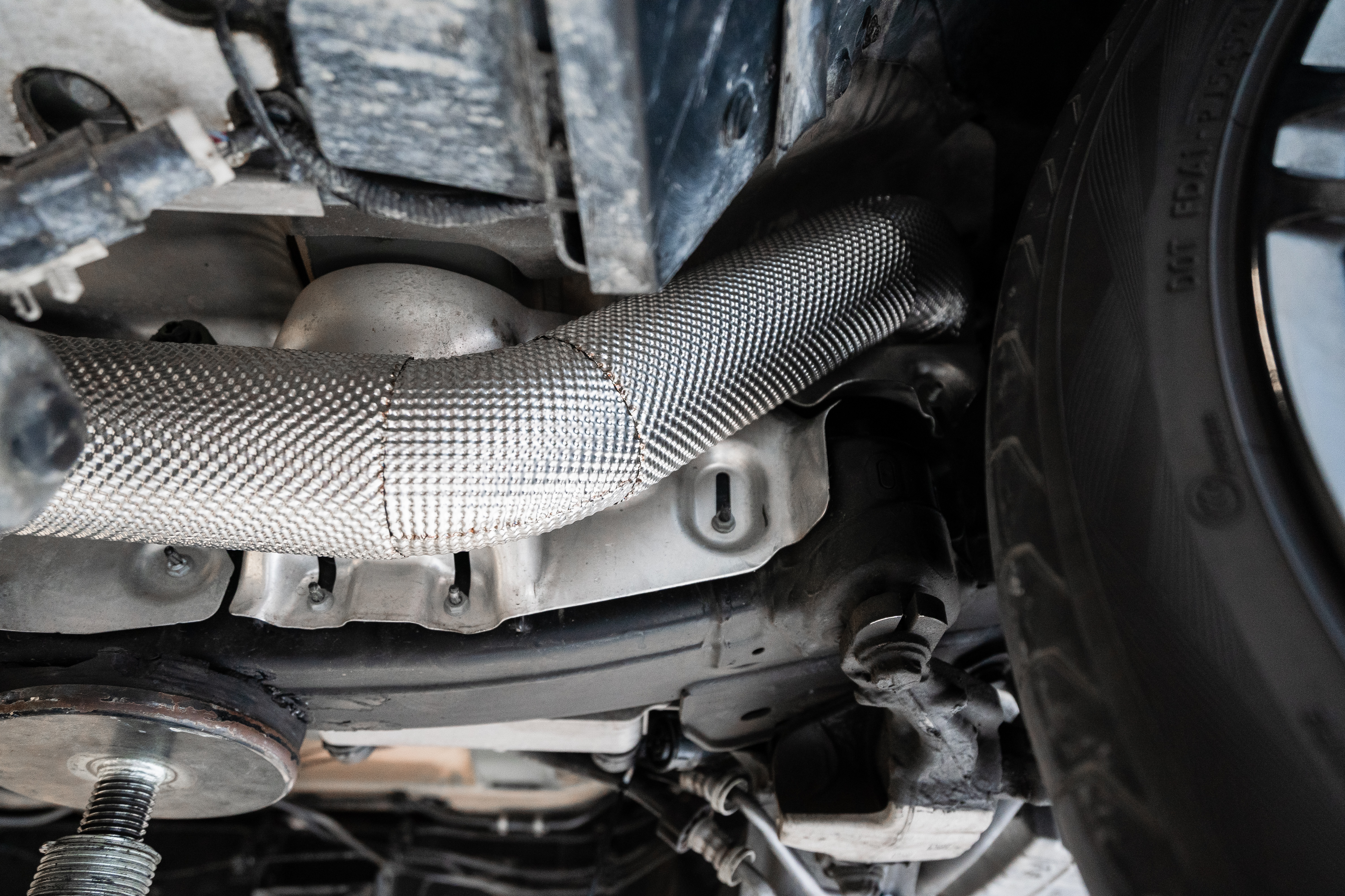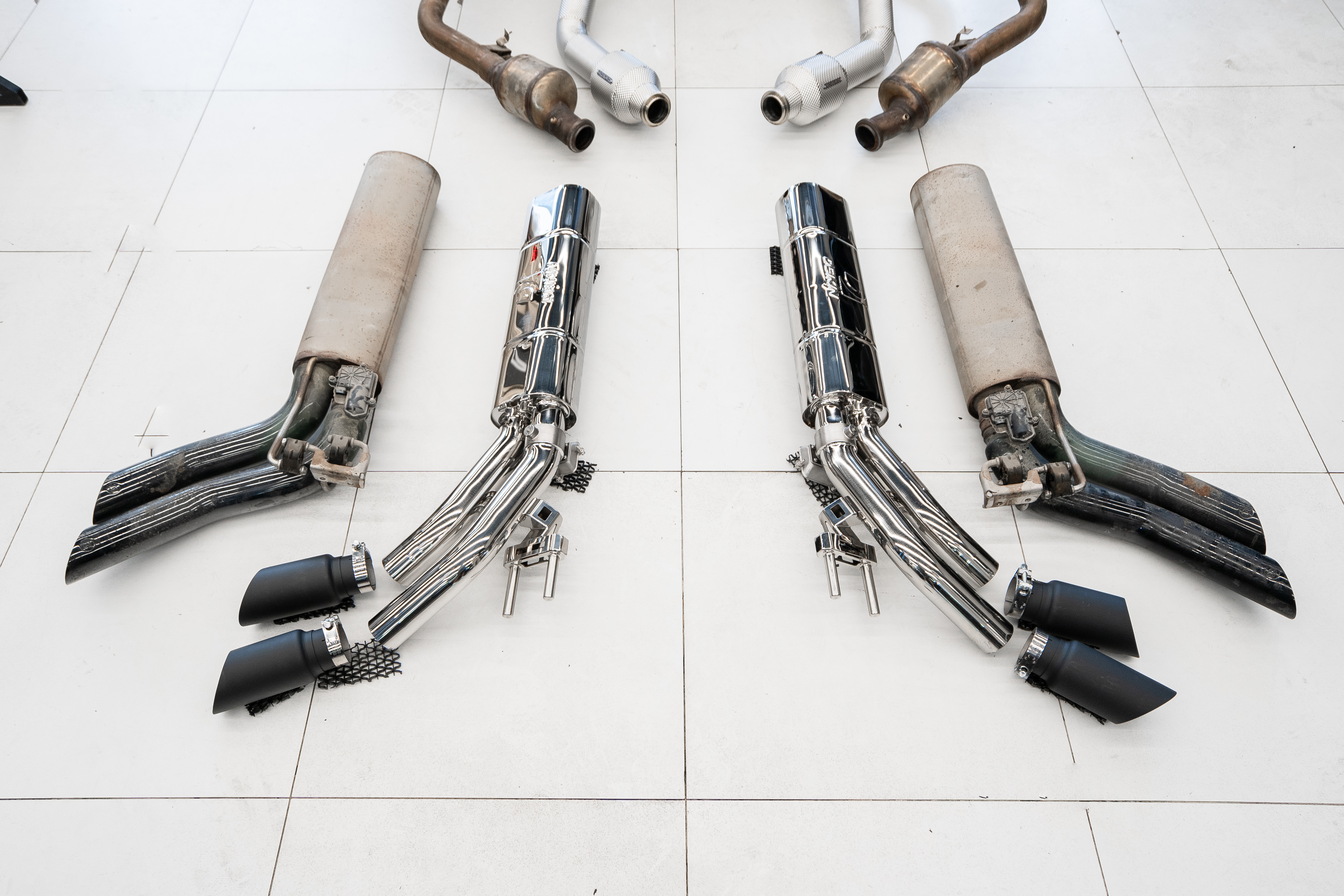The core of the build is a set of M1100 upgraded turbochargers, engineered to increase airflow efficiency and sustain high boost pressure without compromising response. Supporting these turbos required a complete redesign of the exhaust system, including heat-insulated manifolds, high-flow sport catalytic converters, and a custom stainless-steel exhaust optimized for temperature control and gas velocity.