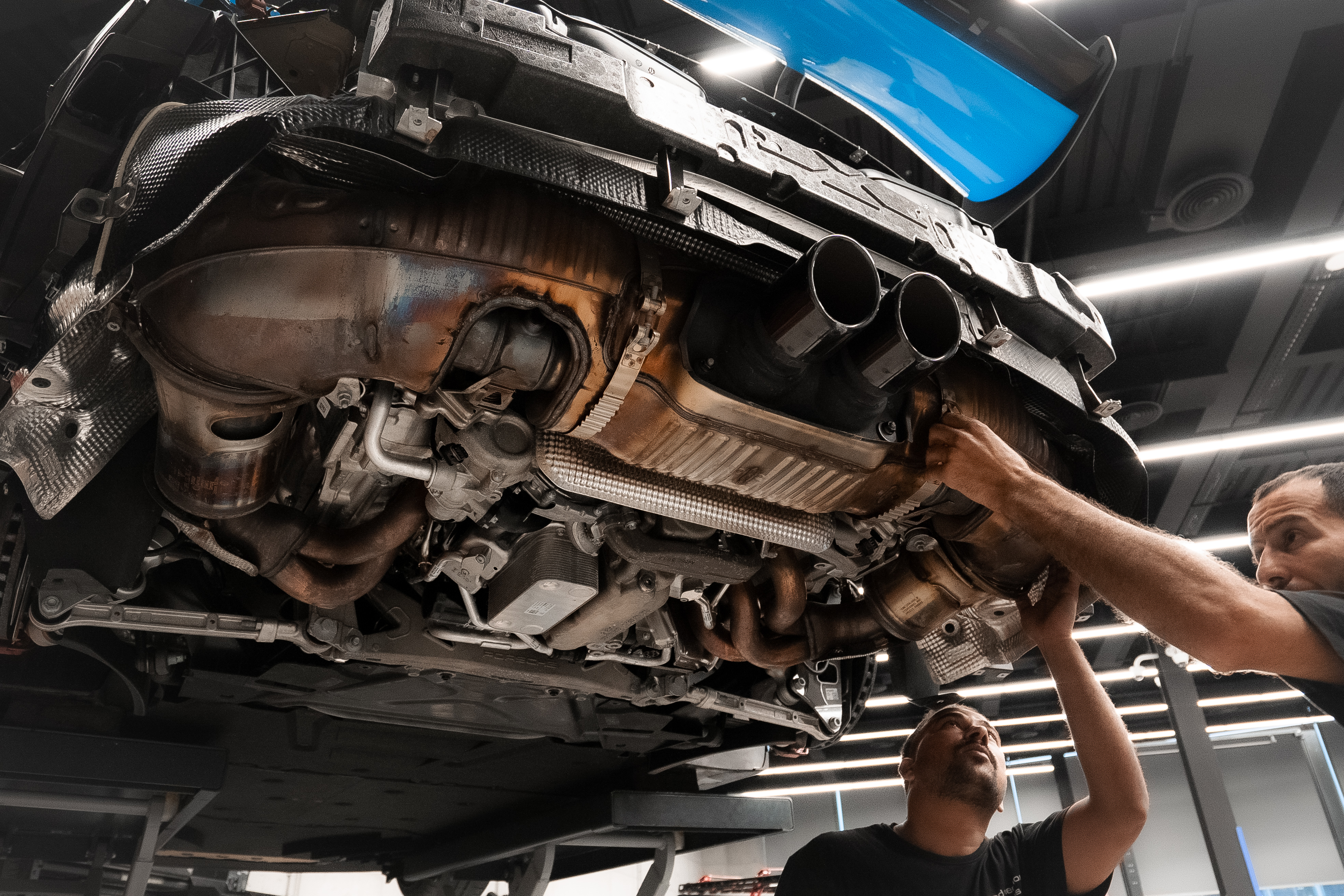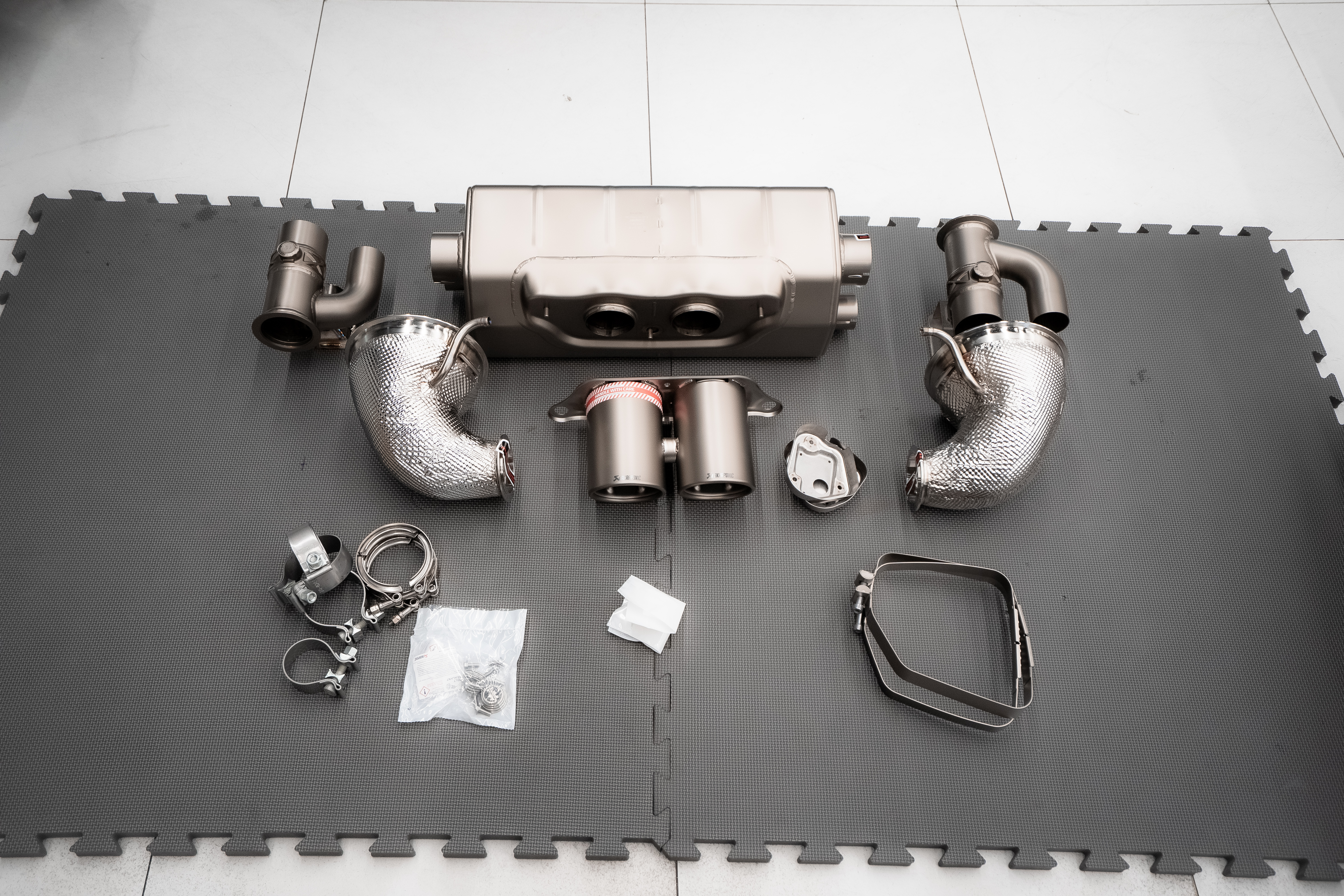 For this project, DEIZ GARAGE installed a complete Akrapovič exhaust system, including cat-back components and precision-engineered adapters designed specifically for the GT3 RS platform. The objective was not to chase volume, but to improve exhaust flow while preserving the engine’s distinctive high-revving character.