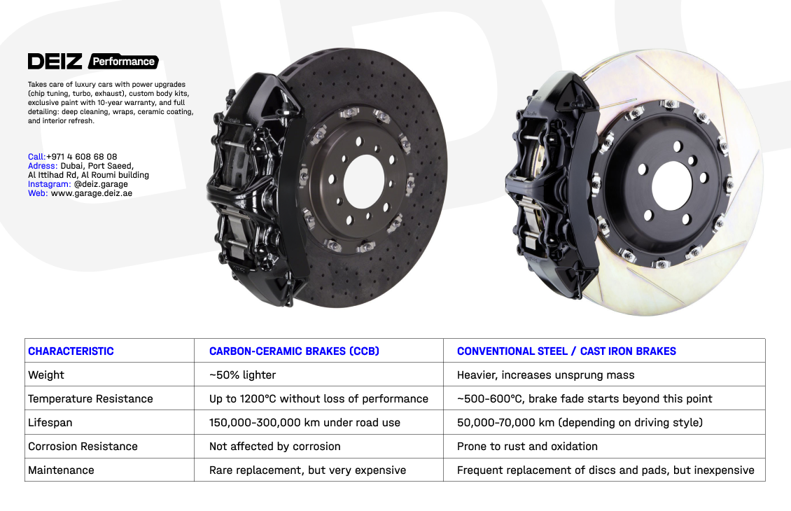 When it comes to high-performance brake technology, carbon-ceramic brake systems represent the pinnacle of automotive engineering. At DEIZ GARAGE, we specialize in professional installation, maintenance, and optimization of carbon ceramic brake systems for luxury and sports cars in Dubai.Why Choose Carbon-Ceramic Brakes?